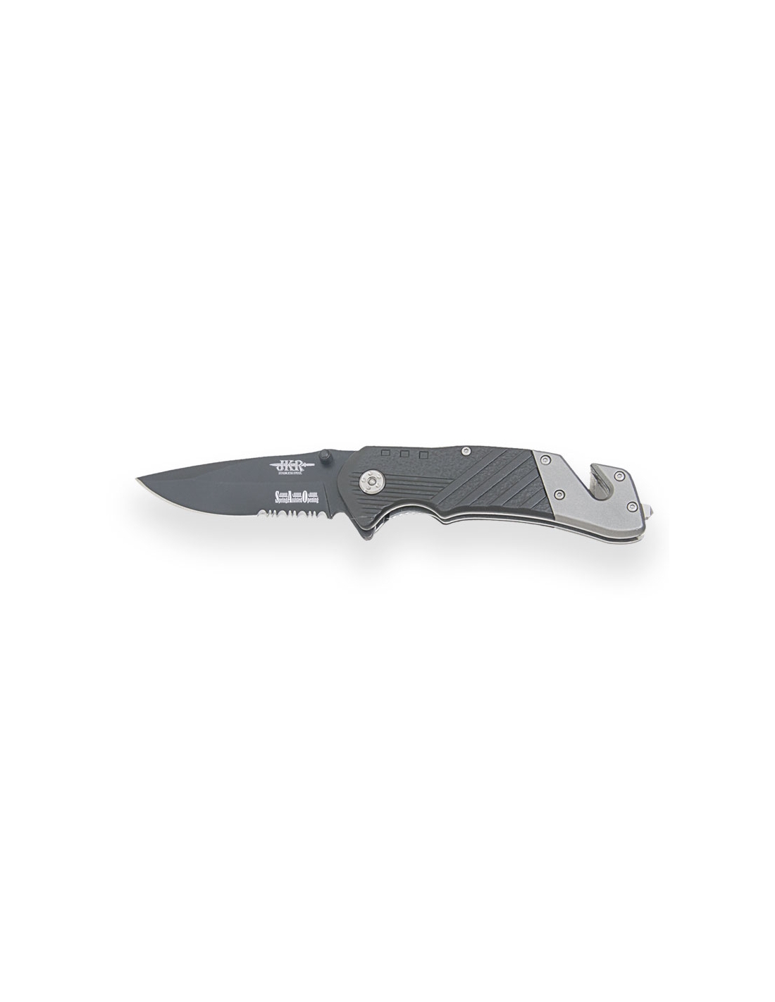 Rescue folding knife made with aluminum handle and black coated blade with 8 cm stainless steel saw.